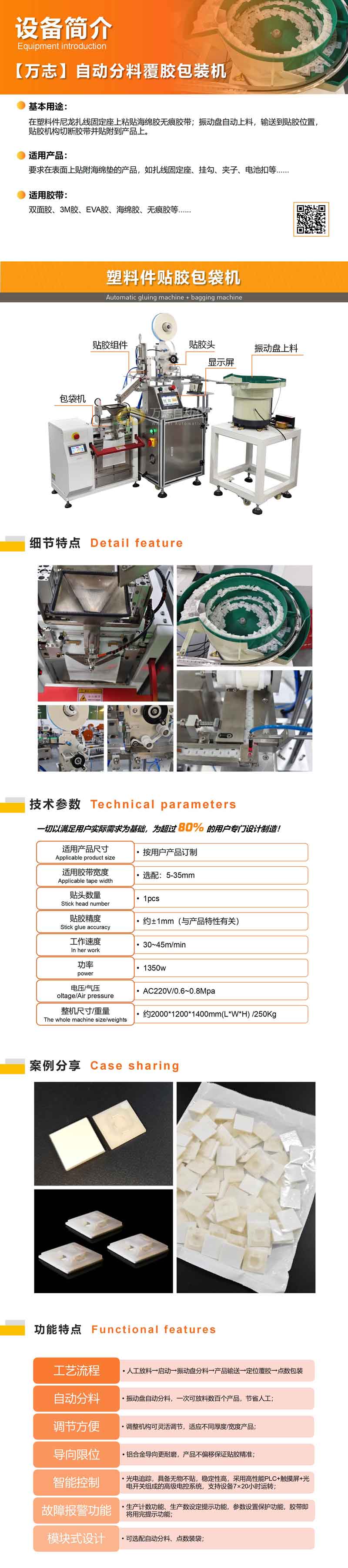 在塑料件尼龍扎線固定座上粘貼海綿膠無痕膠帶;振動盤自動上料,輸送到貼膠位置,貼膠機構切斷膠帶并定位覆膠,點數包裝一體化作業,大量節省人工。